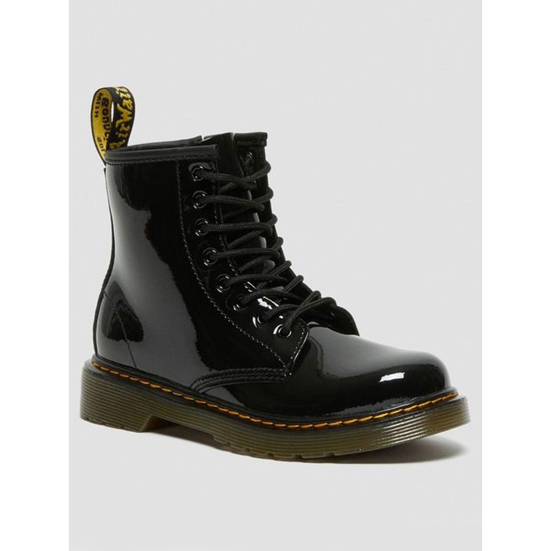 Small soles. Big attitude. Scaling down our Original silhouette, we’ve crafted mini versions of our 1460 boots for up-and-coming renegades. Built from a soft Patent Lamper leather and sitting on a comfortable, flexible sole, these junior boots are perfect for growing feet that don’t keep still. Finished with yellow stitching and a black and yellow heel loop.