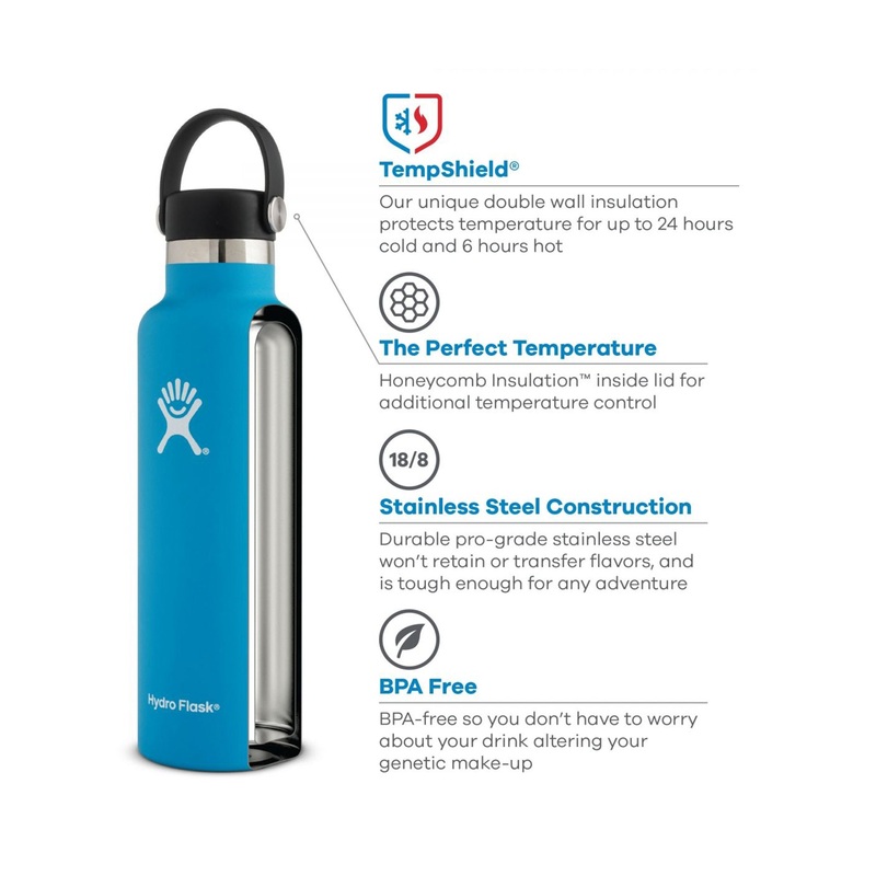 Keeping your fluid intake on the upside is easy when youve got this portable travel buddy. Whether youre headed to the gym or a quick jaunt across town, you can easily take your refreshment with you. Our unique double wall vacuum insulation protects temperature for hours. Cold drinks stay icy cold and hot drinks stay piping hot so you can stay refreshed for any adventure.Made with 18/8 pro-grade stainless steel to ensure pure taste and no flavor transfer – and the durable construction stands up for whatever life brings.Our proprietary powder coat means an easy-grip, sweat-free, and extra-durable bottle that you can take anywhere.
