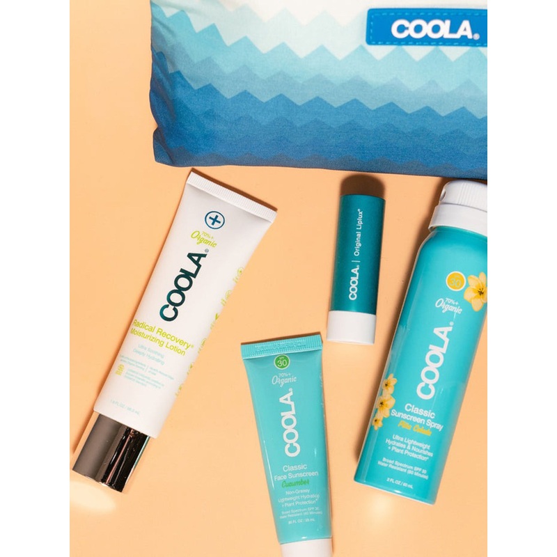 A portable kit with four TSA-friendly sized organicsuncare products in a reusable travel pouch.