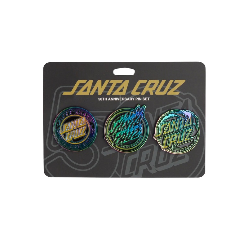 Roll up and stand out in the latest apparel and accessories from Santa Cruz Skateboards. The Santa Cruz 50th Anniversary 3 piece, assorted pin set are 1.25″ round and come with rubber backings. Santa Cruz has been manufacturing iconic skateboards and apparel since 1973. Innovative skateboards and artwork from the beginning ’til the end.