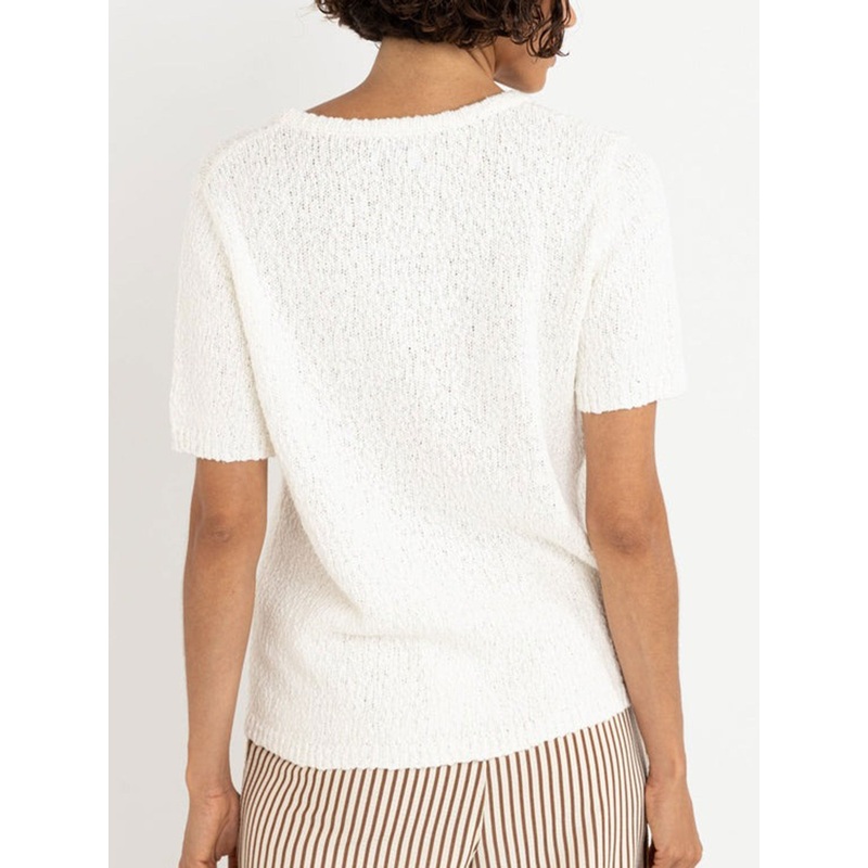 The Adele Short Sleeve Knit Cardigan in white combines effortless style with thoughtful details. Featuring a relaxed fit and three pearl button closures at the centre front, it is designed as a versatile layering piece.