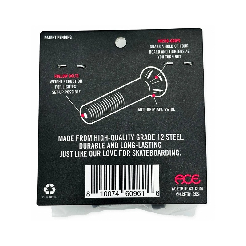 Well, you haven’t seen these before! Leave it to Ace to push the boundaries and lighten your load with all new Hollow Bolts. Not only that, they’ve got built in mini grippers that allow you to put together your board with just one tool.