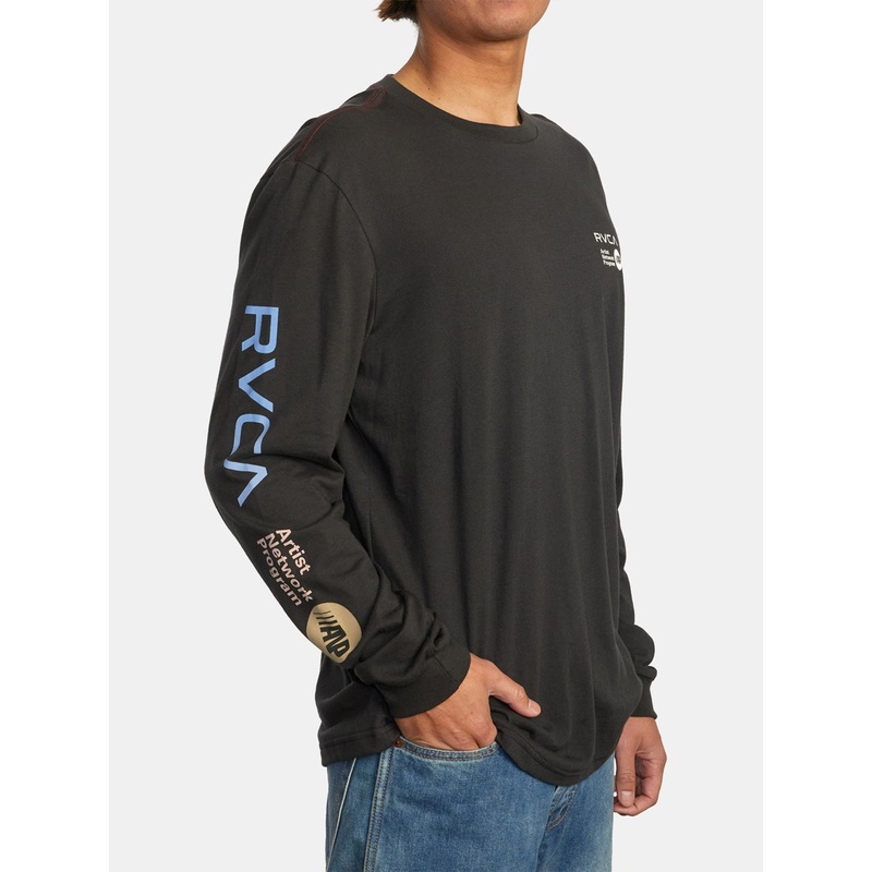 TheRVCAANP Long Sleeve T-Shirt backs a quality staple with creative culture. Standard wash tees for men build on a mid-weight combed cotton base, adding an enzyme wash for even more softness. The premium, regular fit mens t-shirts are topped with rvcas trademark red stitching at the shoulder seam. The mens long sleeve t-shirt is part of rvcas artist network program, featuring anp logo prints at the left chest and both sleeves.