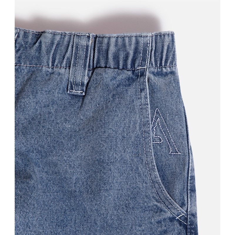 12oz denim relaxed fit jeans with an elastic waist, red lace draw cord, embroidery on front and back pockets.