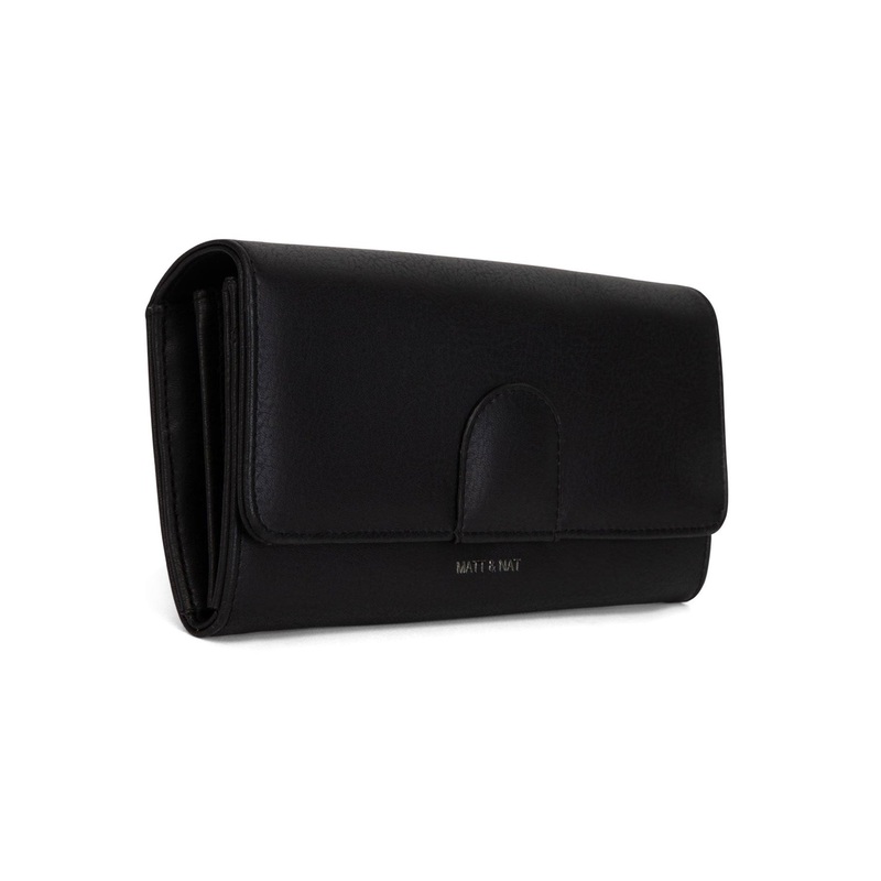 Wallet with a flap closure and a zipper pocket at the back.