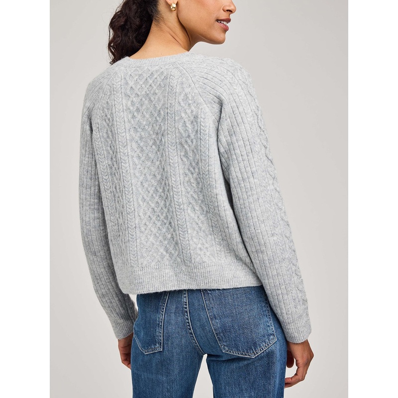 The Aspen sweater is made of a cozy yarn with a cable knit pattern throughout. Features include raglan sleeves and a half placket with buttons.