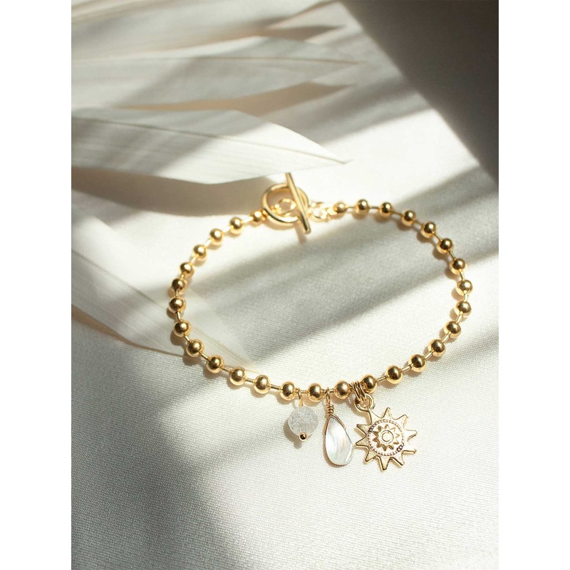 You’ll wear this bracelet from dusk till dawn. Aube is a golden stainless steel ball chain bracelet with a toggle clasp. It is adorned with three delicate charms; a 24K gold plated sun medallion, a quartz bead and a drop-shaped mother of pearl pendant.