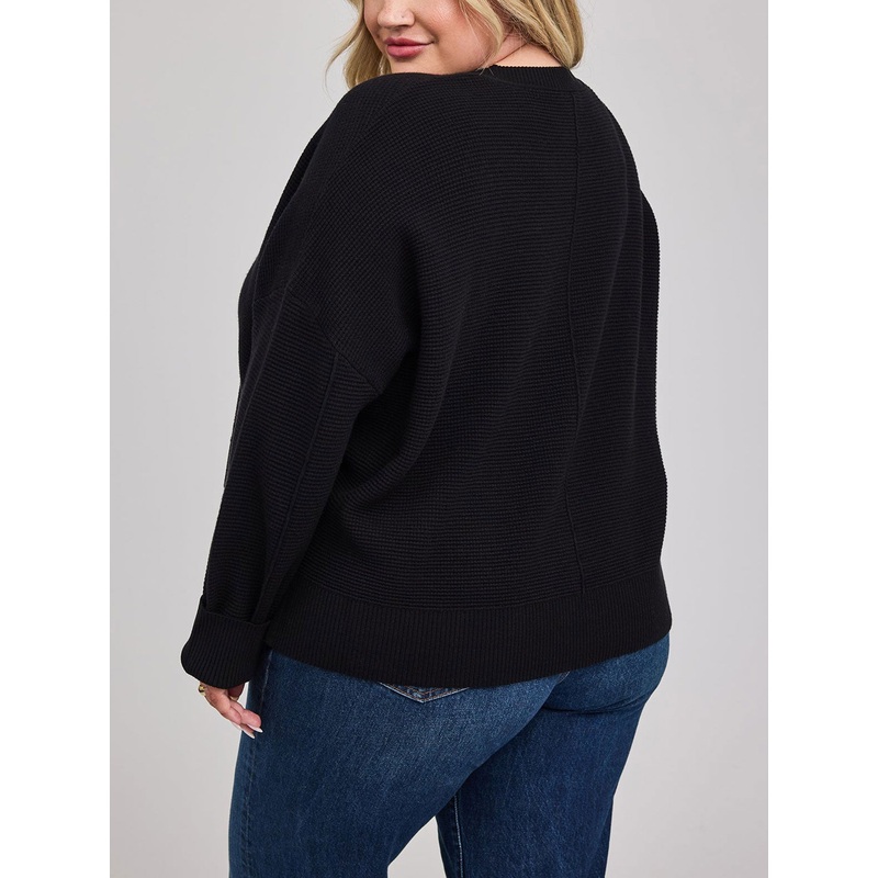 The Axel sweater is made of a soft yarn in a waffle knit pattern. Features include a crew neckline, seam details, and side slits.