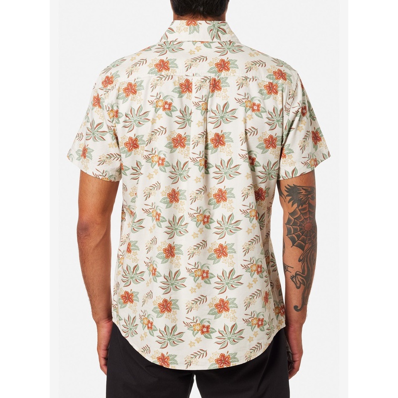 The Benji Shirt features a custom floral pattern inspired by the islands on a cotton blend fabric, perfect for any occasion.