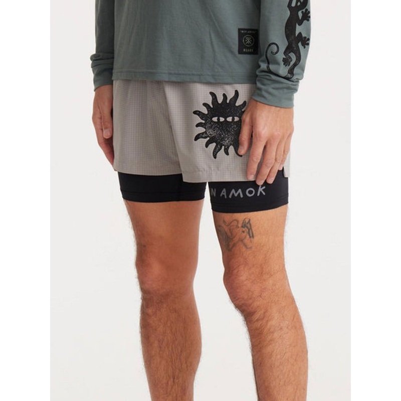 Run Amoks layered short. Made with a lightweight, microperforated 4-way stretch fabric. An exposed, integrated breathable compression liner features a phone ready pocket. The shell maintains Run Amoks attention to detail with two magnetic close slash pockets, back zip pockets and enhanced ventilation. Created with intention for everyday athletic use.