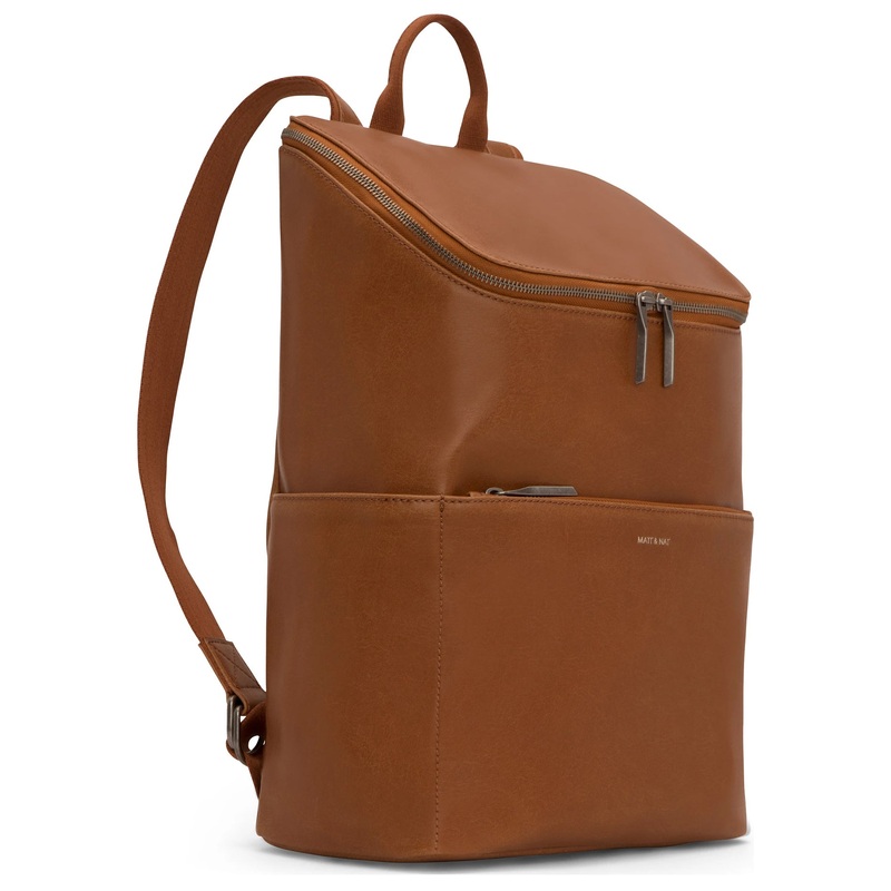 Backpack with top zipper closure. Adjustable webbing straps. Side pockets and front zipper pocket. Fits a 13″ laptop.
