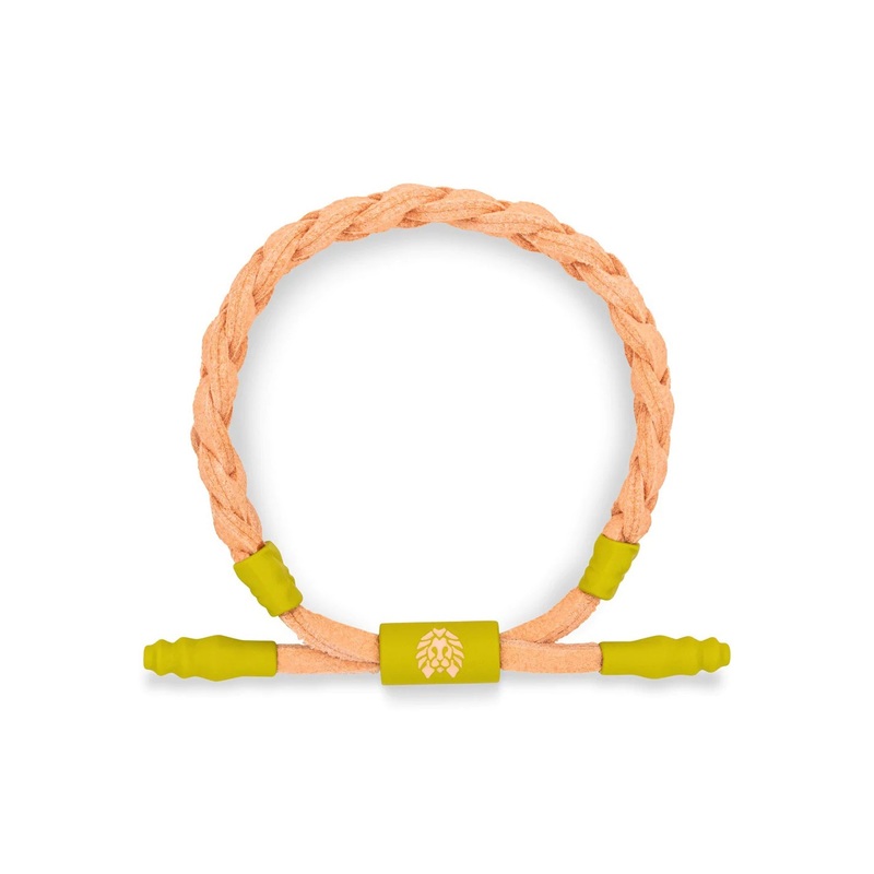 A LITTLE BIT SOFTER NOW. THIS PINK BRAIDED BRACELET FEATURES FAUX SUEDE LACE AND CUSTOM-SHAPED, RUBBERIZED AGLETS AND GROUPERS.