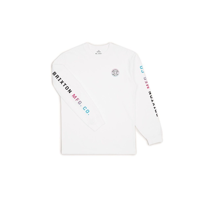 This is the Brixton Crest Standard Long Sleeve T in White, Light Blue and Pink. Made of 100% cotton and ready to wear solo or layered, this tee delivers style with minimal effort.