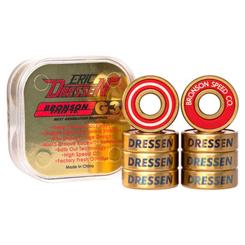Bronson Speed Co is proud to release Eric Dressen’s signature G3 bearing featuring a metallic gold and red colorway with Dressen laser etching on the outside bearing race. Go fast, stay fast with Bronson bearings!