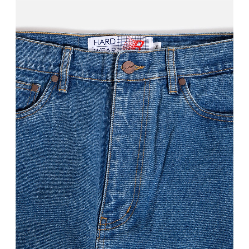 Loosefit denim pants with custom embroideredgraphics onrear pocket.