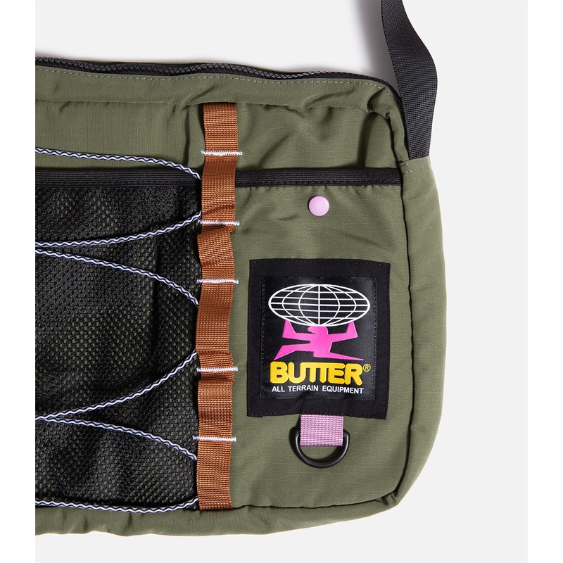 Side bag with big front mesh pocket, zip top closure, woven label on front pocket and an adjustable woven taping trap.