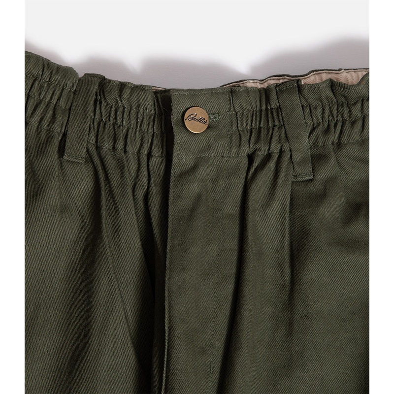 Wide leg pants with custom button closure and woven label above rear pocket.