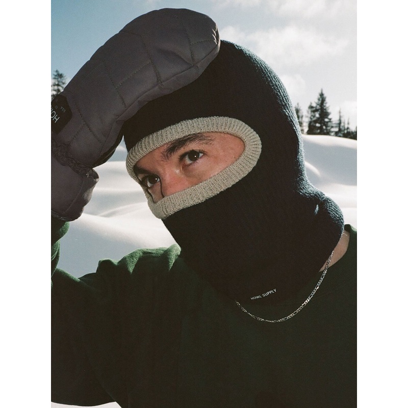 A soft acrylic facemask in rib knit, with contrast eye opening and a canvas printed label.