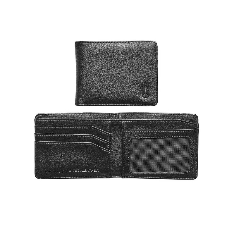 Vegan leather wallet with embossed interior. Features easy access currency sleeve, mesh ID window, and custom metal logo rivet at front.