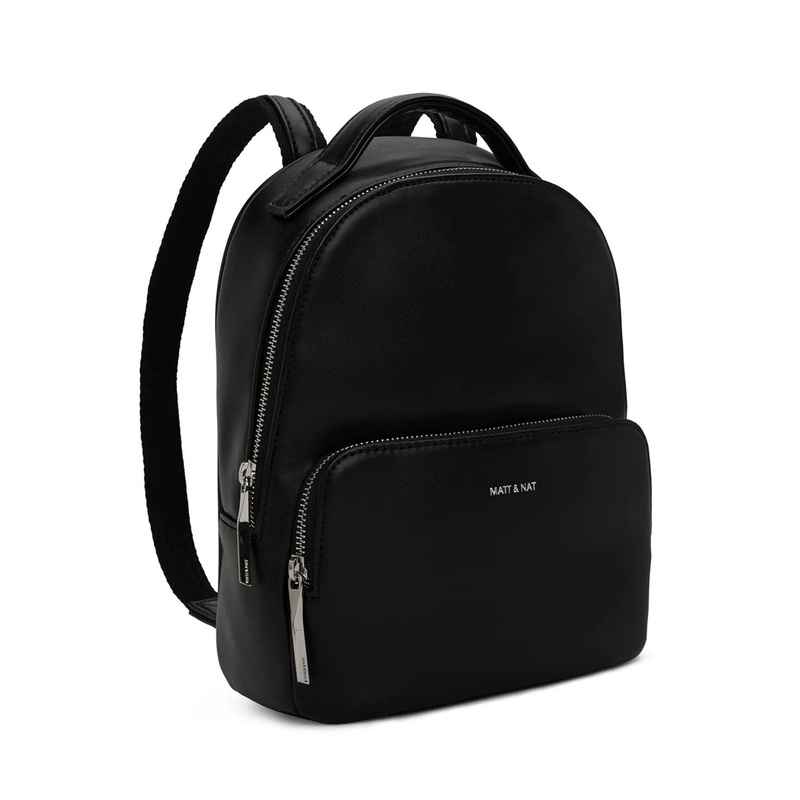 Small backpack with adjustable shoulder straps, top handle to hand-carry, main compartment with zipper closure, and front zipper pocket.