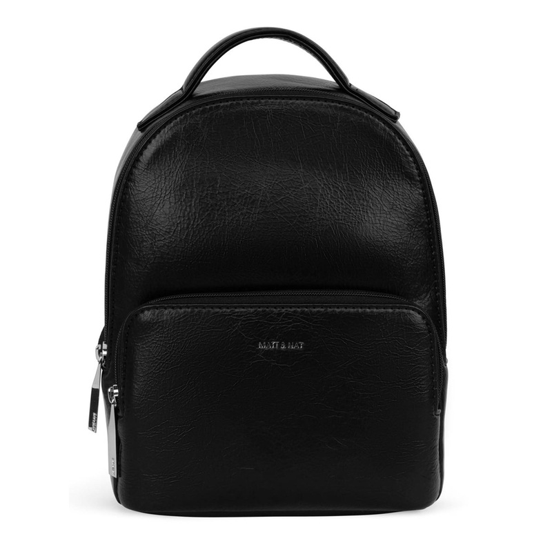 Small backpack with adjustable shoulder straps, top handle to hand-carry, main compartment with zipper closure, and front zipper pocket.