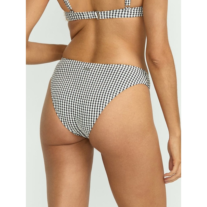 Versatile Wave Check Bondi Bikini Bottom in partially recycled fabric blend with mid-coverage and high or low hip styling. Our logo plate detail elevates swimwear.