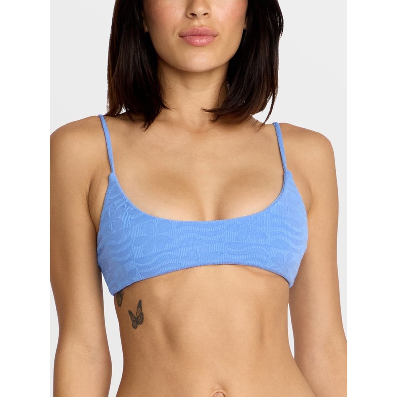 A low-scoop crop bikini top in a recycled polyester blend with removable cups and adjustable straps. Stylish metal rivets detail. Sustainable yet sexy.