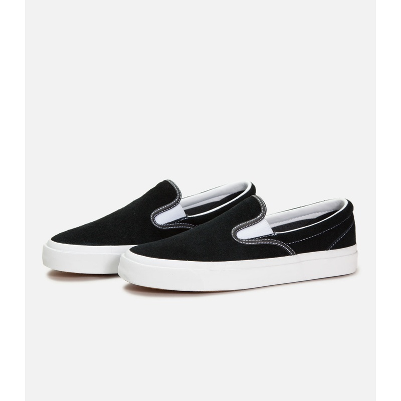Black suede upper with white vulcanized rubber outsole.