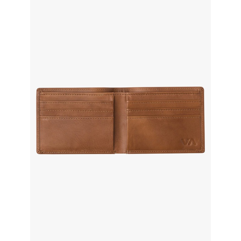 THE CREST BIFOLD WALLET IS A LEATHER WALLET WITH SIX INTERNAL CARD SLOTS AND ONE CASH SLOT. IT HAS A RVCA DEBOSSED LOGO AT THE FRONT.