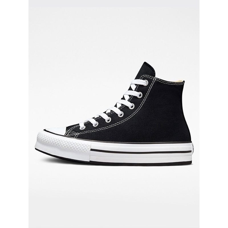 LIFT OFF. The high top, court favorite gets redesigned for kids, with a cushioned SmartFOAM sockliner, plus softened stitches and linings. The classic canvas upper sits on top of an EVA foam platform midsole for elevated style. The look is finished with Chuck Taylor All Star classics like a star ankle patch, contrast midsole stripes, and diamond pattern outsole.