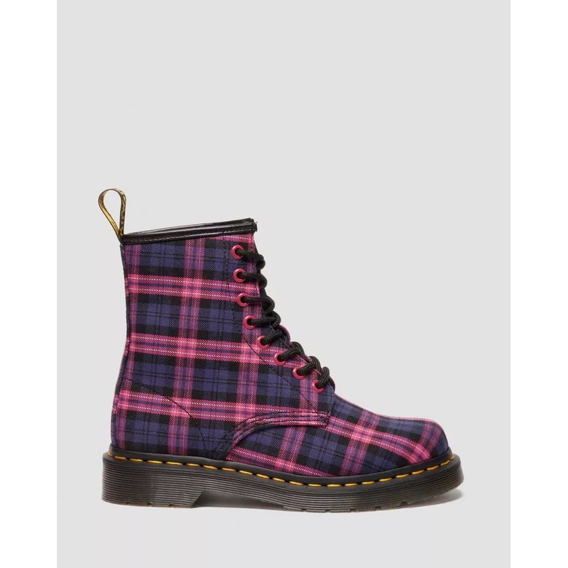 Nothing plain about plaid. This rework of our 1460 8-eye boot boasts an eye-catching all-over tartan design complete with matching pink eyelets. The boots woven upper is also tagged with our unmistakable black and yellow heel loop. The air-cushioned DMS sole is marked with our signature grooving pattern and secured with yellow welt stitching plus our unique undersole tread.