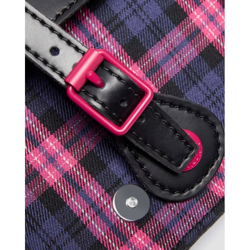 Kiev leather is a modified version of our classic Smooth leather, with a PU coating, polished surface and slight sheen. Tartan Woven material is crafted from polyester with a blend of standout fuschia, purple and white plaid stitching