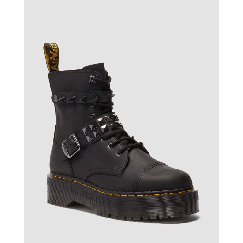 Underground hardware for broad daylight attitude. This hardware-heavy rework of our Jadon platform boot is built from rugged Burnished Waxy Pull Up leather and adorned with spiked and studded straps inspired by belts and wristbands. The platform Quad sole is grooved, welted, and marked with yellow welt stitching, while the top of the boot is tagged with our black and yellow heel loop.