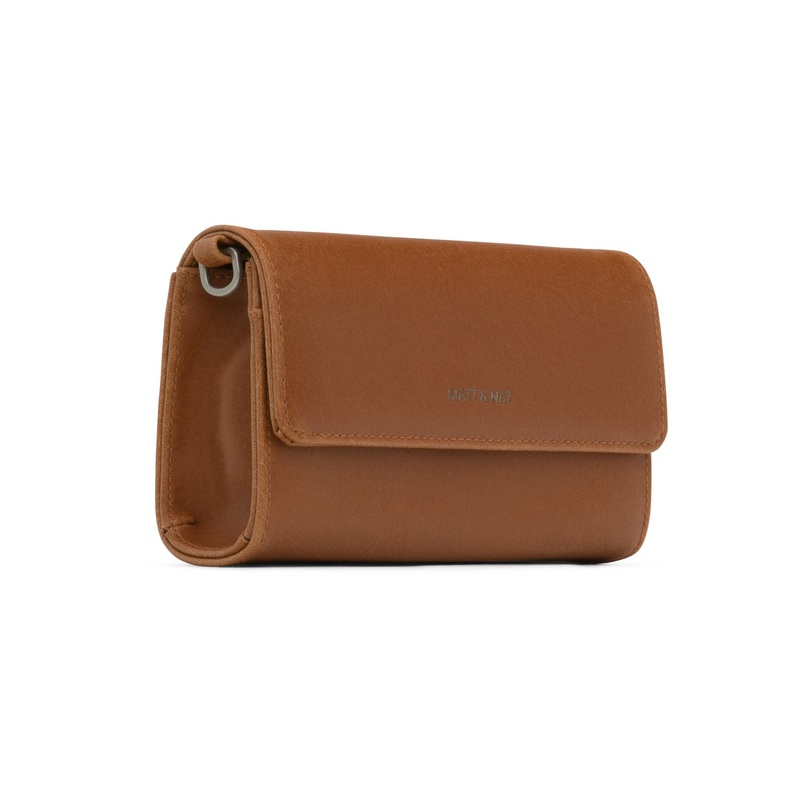 Structured crossbody bag with a detachable strap. Top flap with magnetic snap closure. Slip pocket on front and back of bag.
