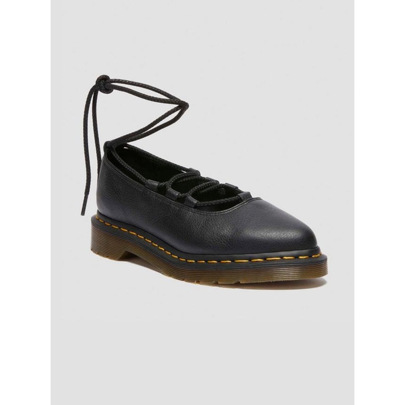 Get to the point. The Elphie ballet flat is our twist on a classic. Less dainty. More Docs. A pointed ballet flat shoe made from soft Virginia leather. Fitted with wraparound laces easily swapped out for a customized look. The tapered sole is marked with DM’s signature grooving pattern and secured with yellow welt stitching.