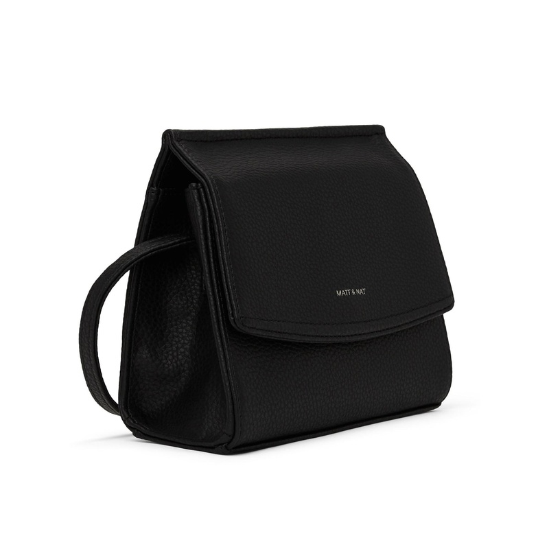 Crossbody bag with flap and hidden snap closure with an adjustable strap.