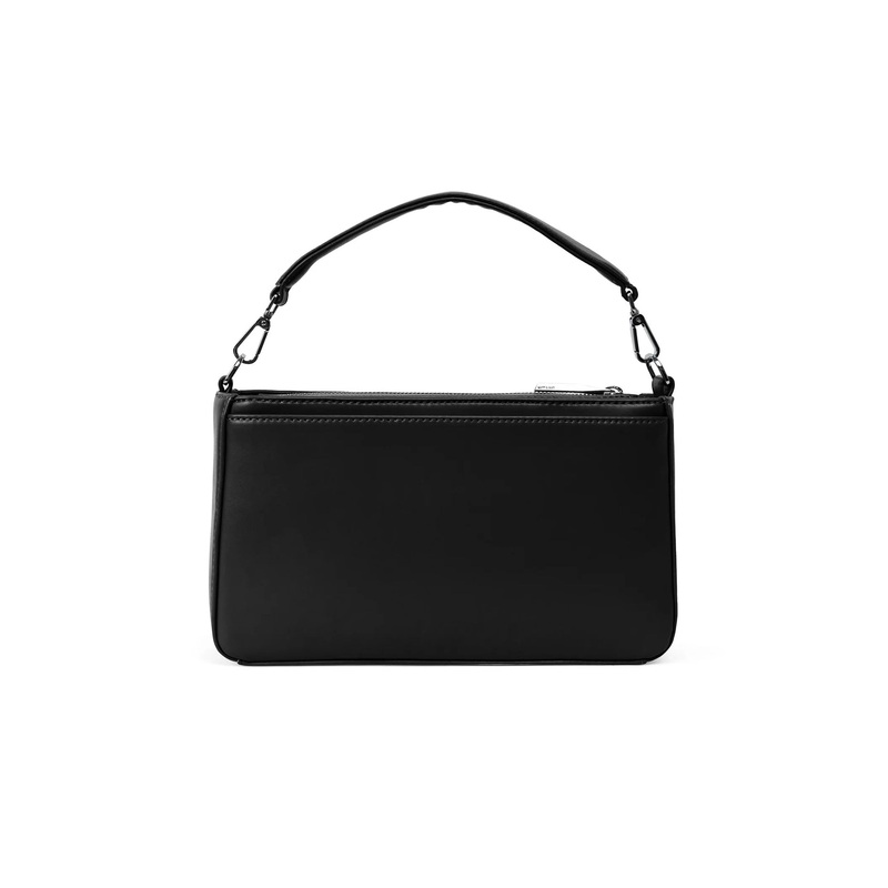 Convertible crossbody/shoulder bag with a detachable and adjustable webbing strap, a detachable top handle to hand-carry, zip closure at the main compartment, and front and back slip pockets with snap closure.