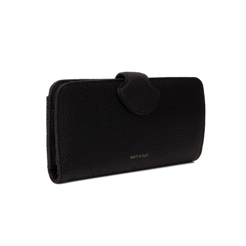 Folded wallet with a tab closure and a zipper pocket at the back.