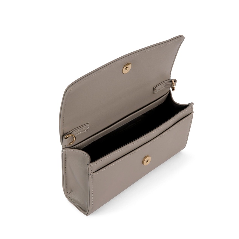 Structured crossbody bag with a detachable strap, flap ith a magnetic snap closure, and a slip pocket on the front and back of the bag.
