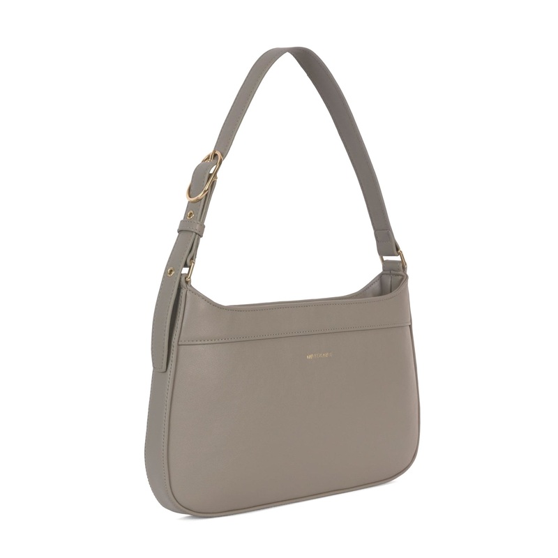 Slim shoulder bag with a top zipper closure and an adjustable buckle strap.