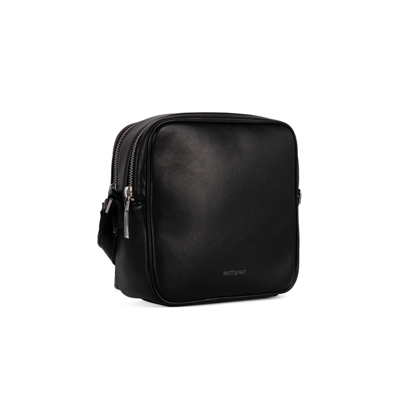 A double-compartment crossbody bag with zippered closures and an adjustable strap.