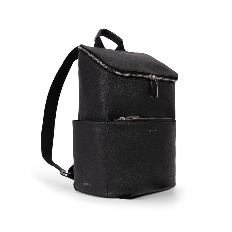 Backpack with top zipper closure. Adjustable webbing straps. Side pockets and front zipper pocket. Fits a 13 laptop.