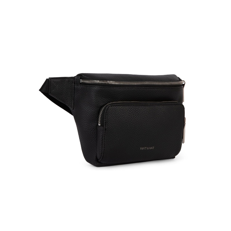 Belt bag with a zippered main compartment and a front zip pocket. Buckle belt strap for comfortable wear around the waist or across the chest. The front pocket can fit a large smartphone.