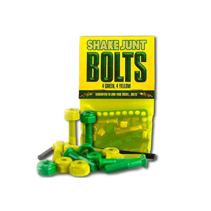 Shake Junt Signature Bolts come withFOURGREENbolts, FOUR YELLOWbolts. Made out of high quality, top secret material. Will not break! #1 Homie Approved! Guaranteed to make you land your tricks… BOLTS!
