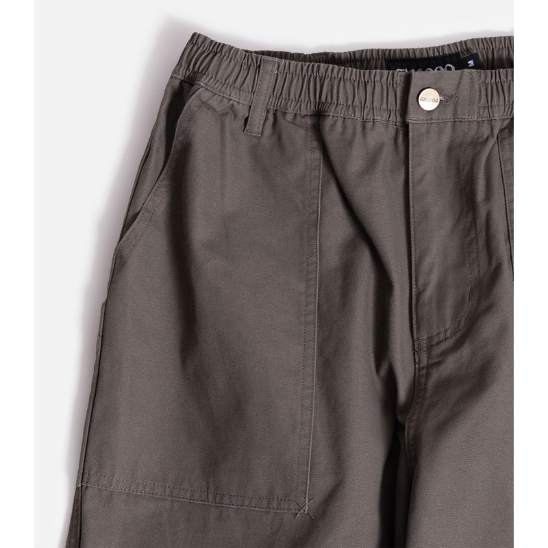 Loose fitting field pants with an elasticated waist, adjustable pulls on the leg openings and unconventional rear pockets.