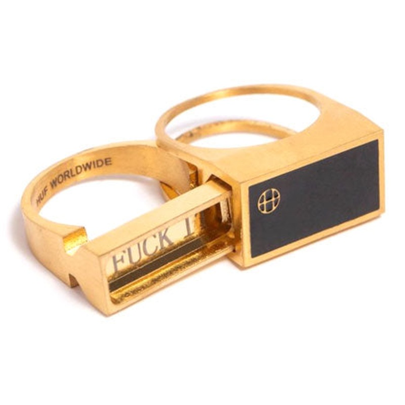 Hide your goods with the Circle H Stash Ring. A two-piece faux gold design, the ring features a Circle H on black enamel at the exterior, while an interior stash compartment reveals HUFs iconic Fuck It slogan.