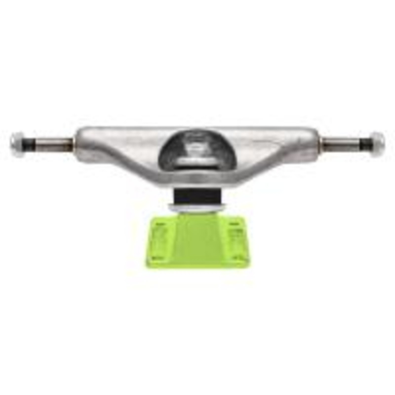 Independent Forged Hollow Tony Hawk Transmission trucks featuring artwork by Mark Mothersbaugh. Polished silver hanger with pad printed Hawk logo art graphic on front and laser etched signature on back, anodized neon green baseplate, black cushions, and silver hardware.