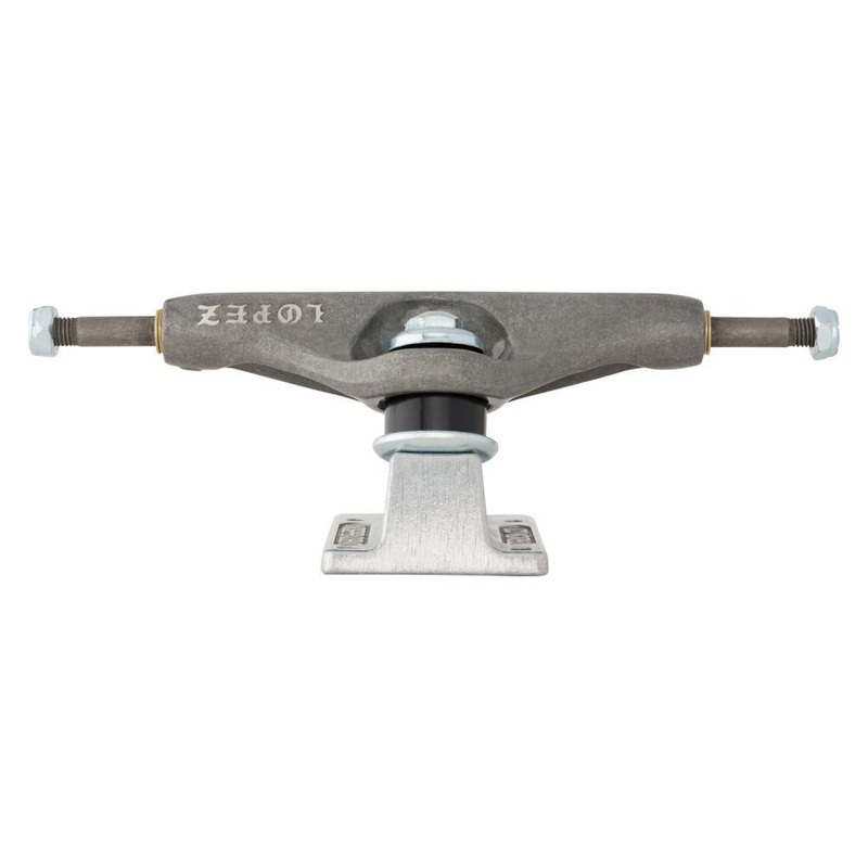 The Independent Stage 11 Louie Lopez IKP Standard Trucks is Indy’s first inverted kingpin standard height truck featuring clear trans black powder coated hanger with lazer etched Louie graphic art, polished silver baseplate, black cushions, and silver hardware