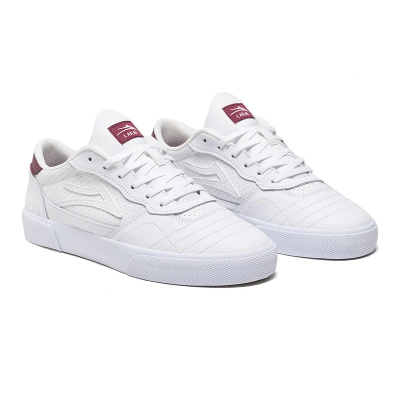 These are the Lakai Cambridge Skate Shoes in White leather and burgundy. The Cambridge consists of mixed materials including suede, mesh, and perforated synthetic leather, giving the shoe a modern look without forfeiting its vintage vibe. This mix of contemporary and classic keeps the shoe from being pigeonholed to a specific look, catching the eye of minimalist and tech skaters alike. The Cambridge has been paired with a PARA-MOUNT outsole, their most advanced vulcanized outsole to date, and finished with a DELUX-LITE footbed.