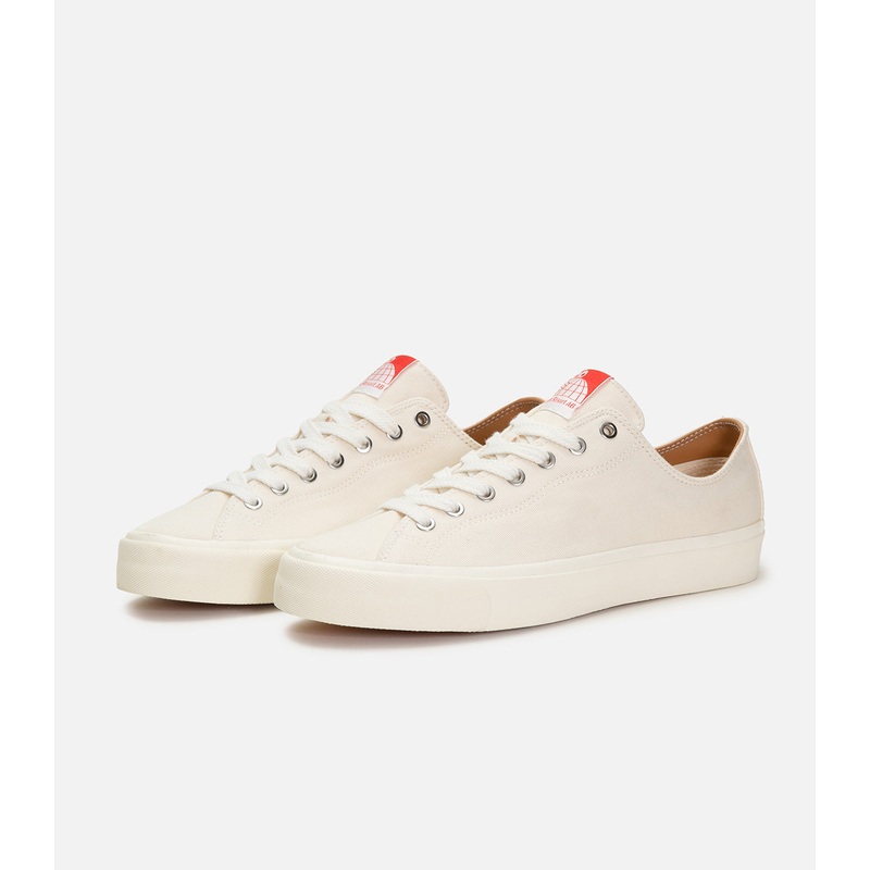 Canvasupper with leather insole, leather sock liner and a glossy white vulcanized rubber outsole.